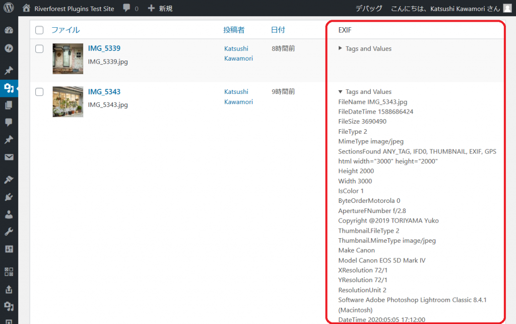 インストールすると、メディアライブラリのカラムに EXIF が追加されます。その欄に、EXIF タグと値が表示されます。そのデータは、投稿メタデータのメタキー _exif_details に保存されます。また、そのデータ保存をフィルターするフィルターフック exif_details_data を提供します。