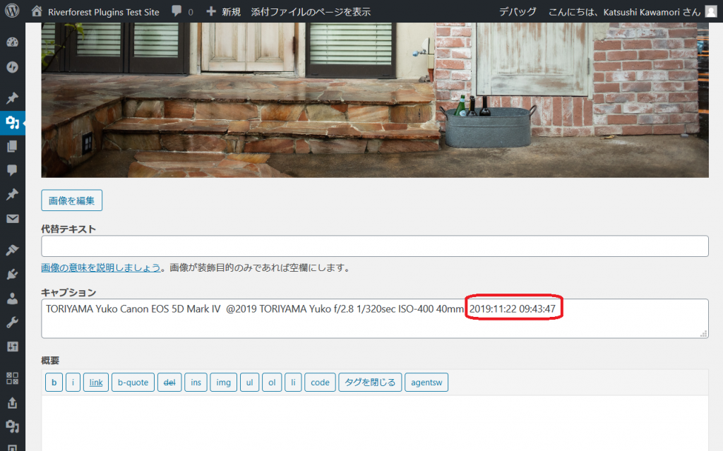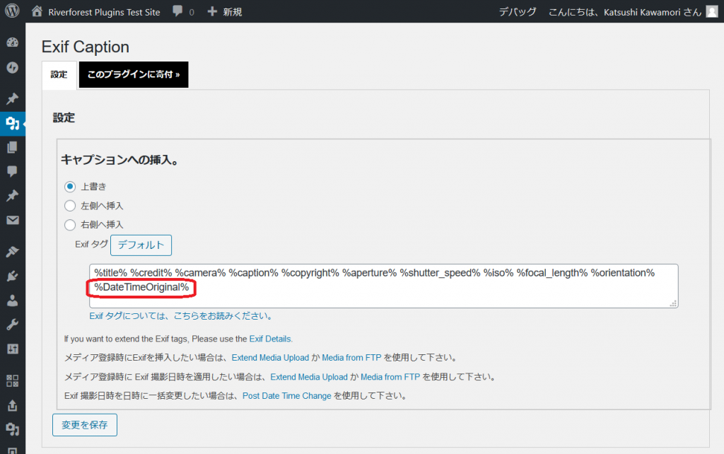 プラグイン Exif Caption の設定で Exif Details で表示される Exif タグを使用できます。タグは % で囲んで使用します。Exif タグを設定すると、メディアのキャプションに出力されます。Exif Caption は最新バージョンを使用してください。
