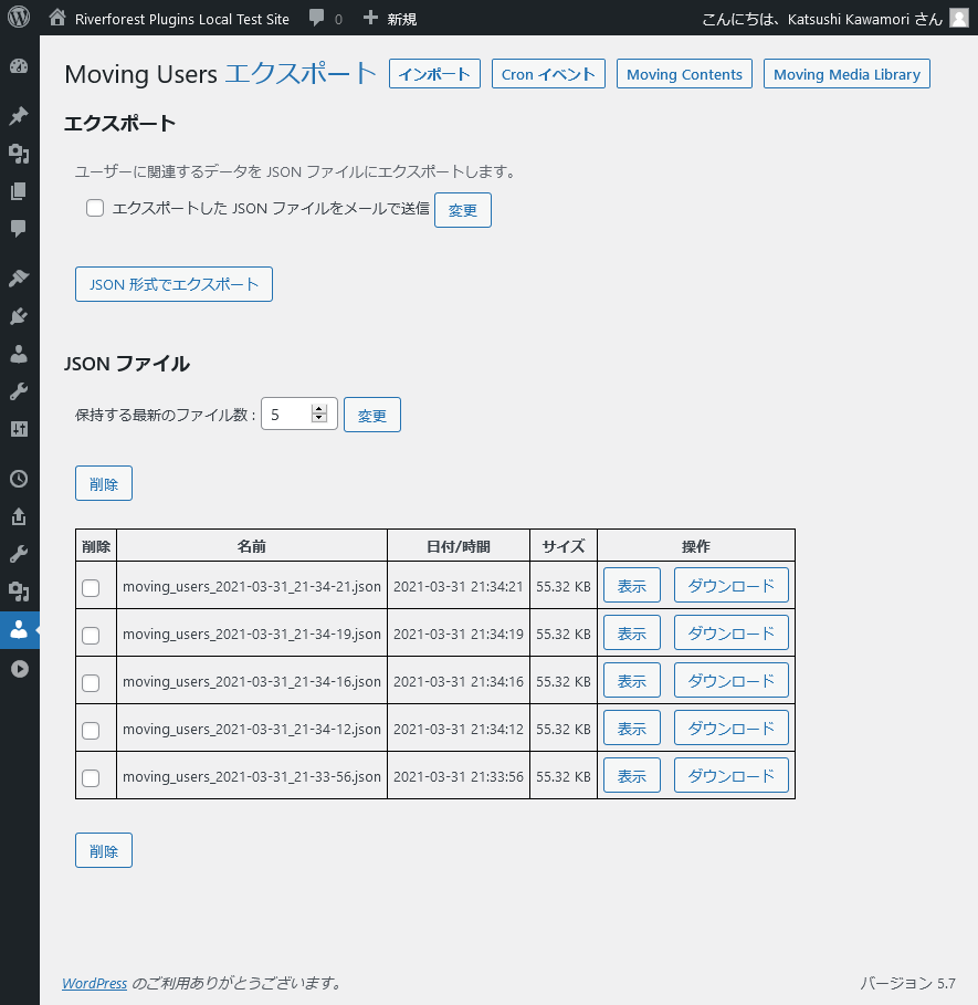- 引っ越し元で、エクスポートします。ユーザー関連のデータベースのデータを JSON ファイルにまとめて出力します。