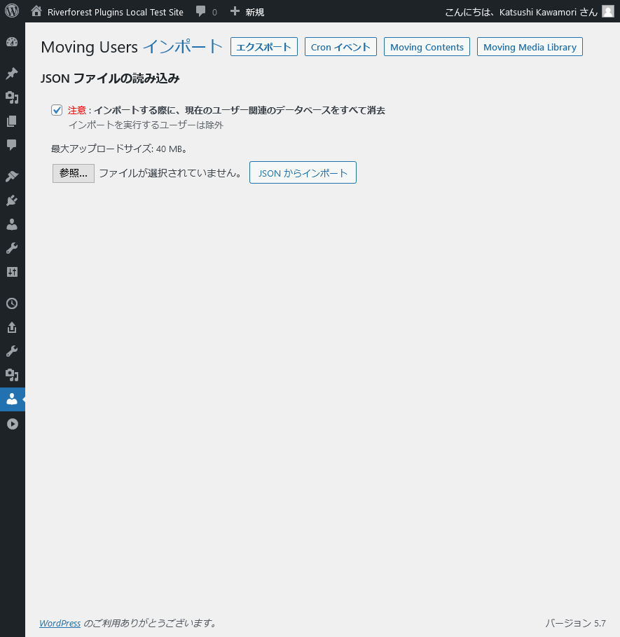 - 注意:インポートする際に、引越し先のサイトのユーザーのデータベースをクリアします。インポートを実行するユーザーはクリアされません。