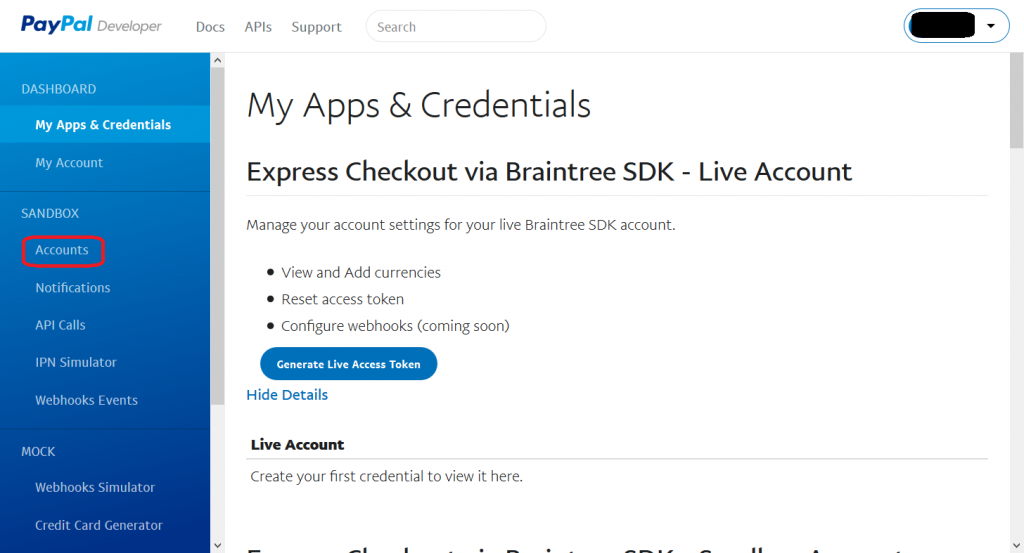 - DASHBOARD ページ内の SANDBOX – Accounts をクリックします。