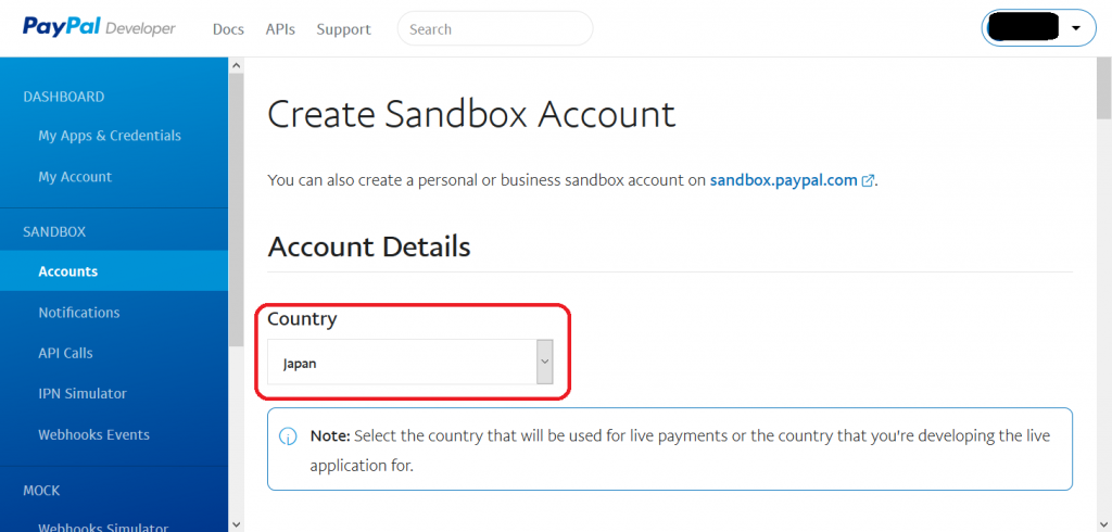 - Create Sandbox Account ページ内で Country を選択します。