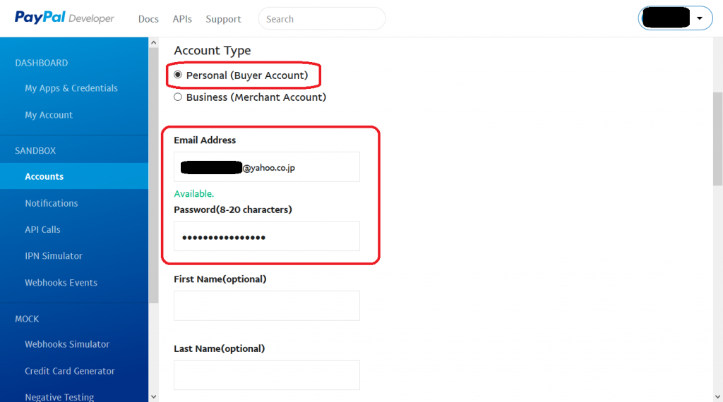 - Create Sandbox Account ページ内で Account Type Personal(Buyer Account) 「買い手アカウント」を選択します。 「買い手アカウント」用のメールアドレス、パスワードも入力します。