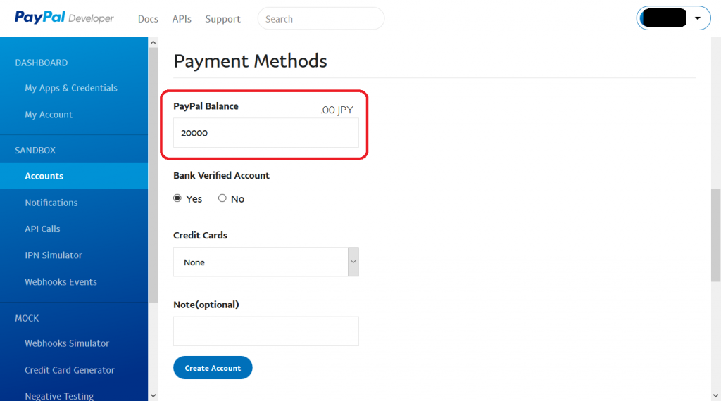 - Create Sandbox Account ページ内で、PayPal Balance を入力します。これは、「買い手アカウント」が持つ仮のお金です。今回は、20,000 円を入力しておきます。