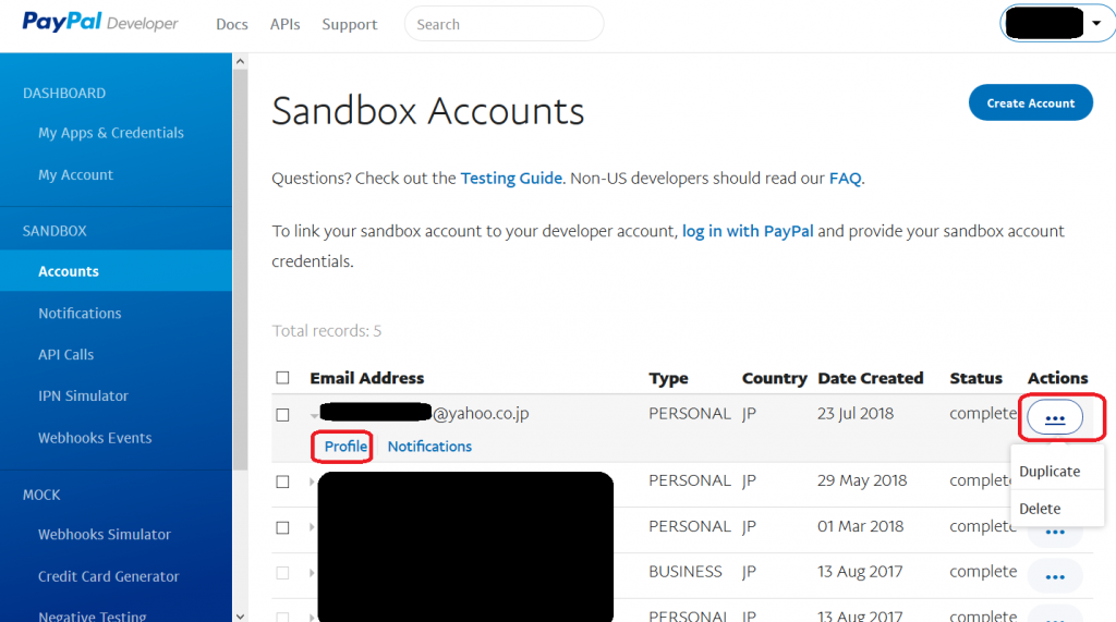 - Sandbox Accounts ページ内の Create Account ボタンをクリックします。