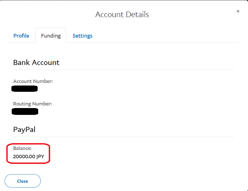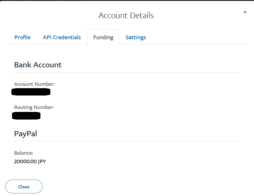 - Funding タブには、現在所持している仮のお金 20,000 円があります。Account Number、Routing Number は自動で作成されます。