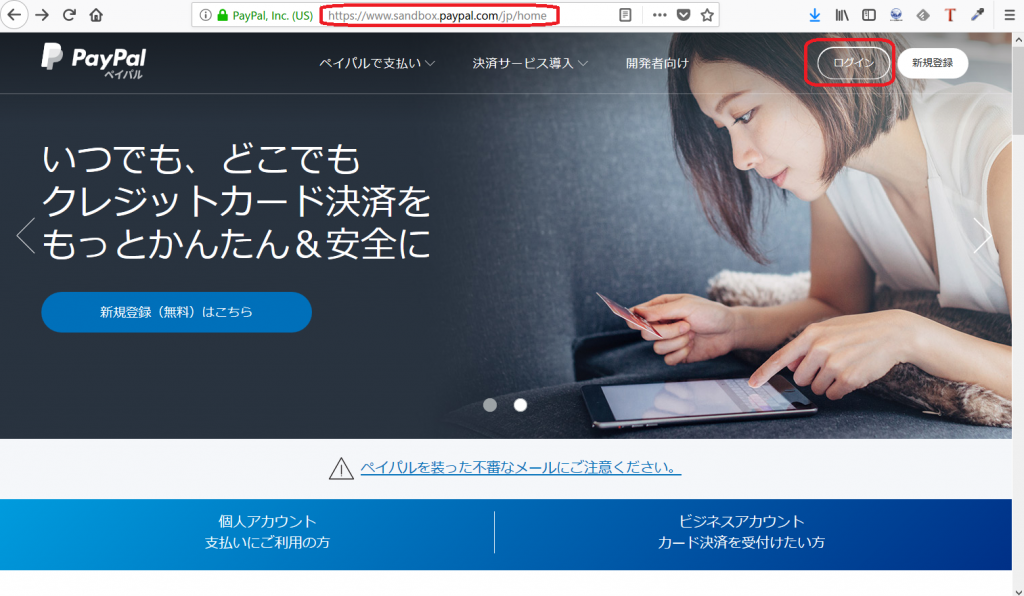 - PayPal の通常のログイン画面にそっくりですが、URL が違います。Sandbox 専用です。