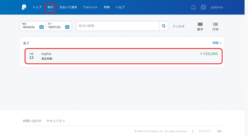 - Sandbox「買い手アカウント」に、再びログインし、取引画面を見てみると、出金が確認できます。