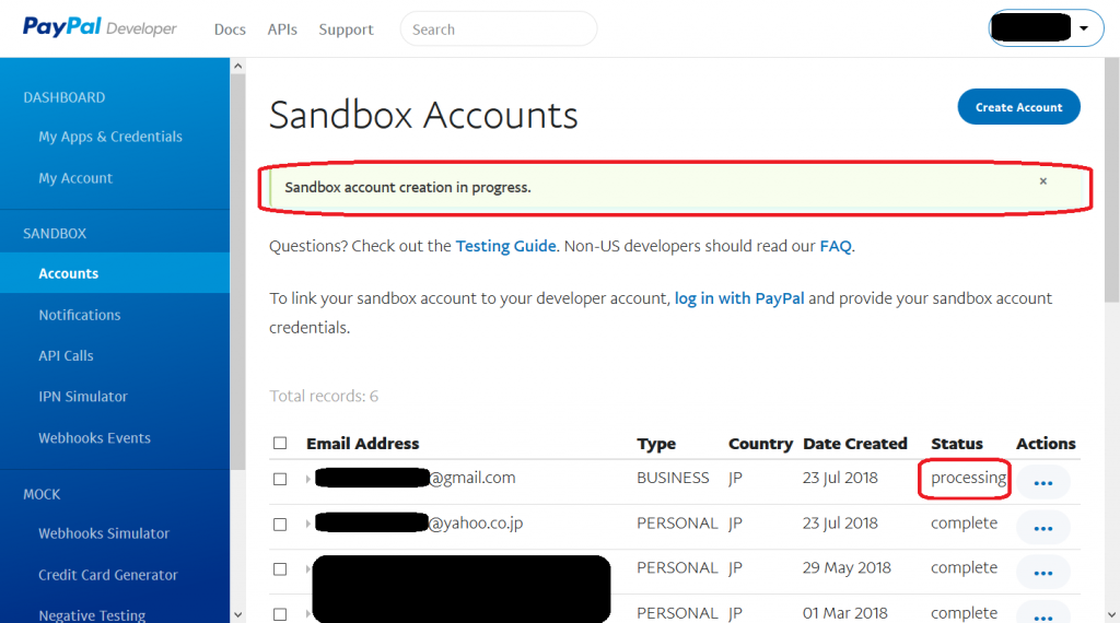 - 新規の Sandbox 「売り手アカウント」が作成されますが、以下の様なメッセージが表示される事があります。そのような場合は、少し待って SANDOBOX – Accounts をクリックしてみます。