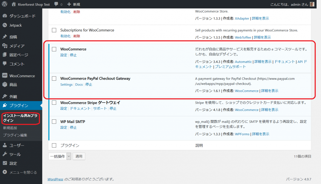 - インストール済みプラグインで、WooCommerce、WooCommerce PayPal Checkout Payment Gateway が有効化されているのを確認します。