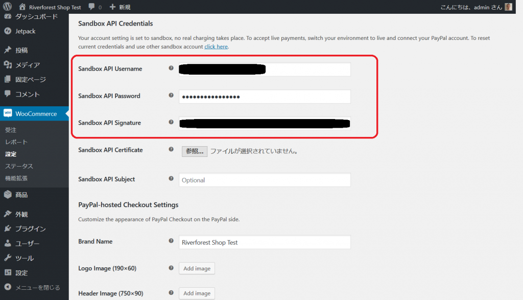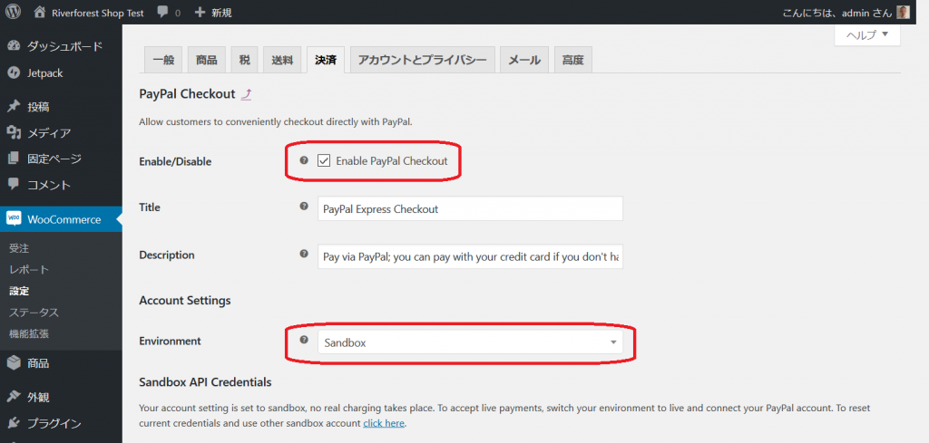 - WooCommerce – 設定 – 決済 – PayPal Checkout で、PayPal Checkout と、Sandbox を有効にし、Sandbox「売り手アカウント」の API キーを入力して保存します。