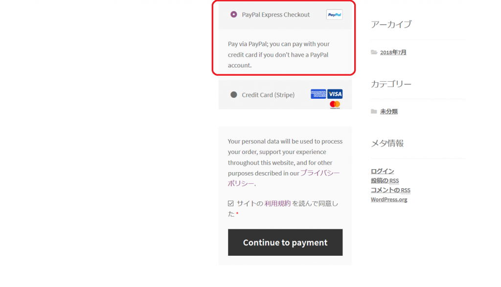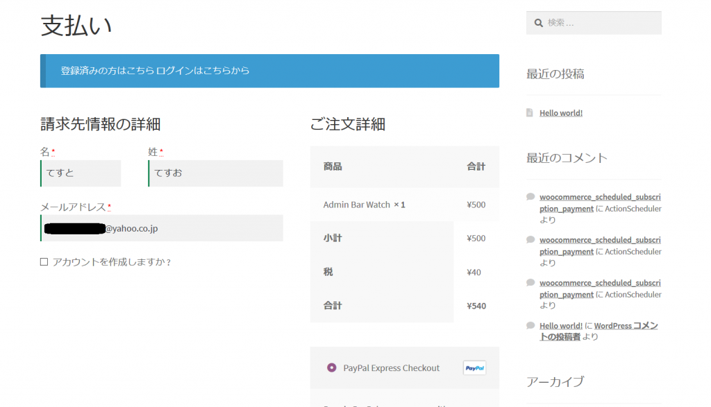 - 支払い画面で、Sandbox「買い手アカウント」のメールアドレスを入力します。PayPal Express Checkout を選択し、支払いを実行します。
