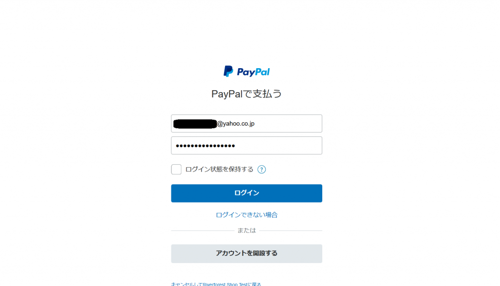 - 画面が、PayPal に遷移します。Sandbox「買い手アカウント」のメールアドレスが自動で入力されるので、Sandbox「買い手アカウント」のパスワードを入力します。