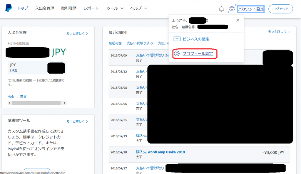 - PayPal にログインし、アカウント設定 – プロフィール設定をクリックします。
