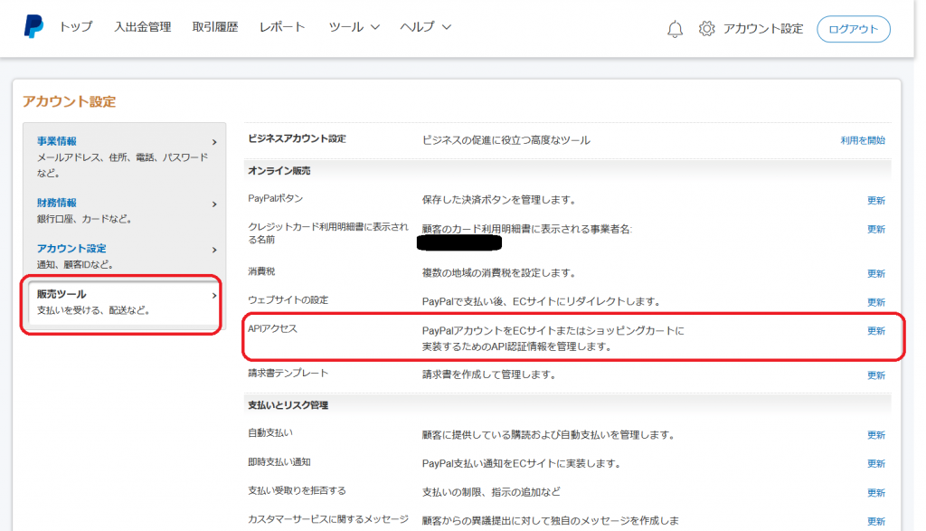 - アカウント設定 – 販売ツール – APIアクセス – 更新をクリックします。