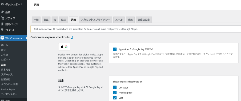 WooCommerce の決済で、プラグイン WooCommerce Stripe Payment Gateway を利用しています。このプラグインでは、Express checkouts で、Apple Pay, Google Pay を利用する事が可能です。