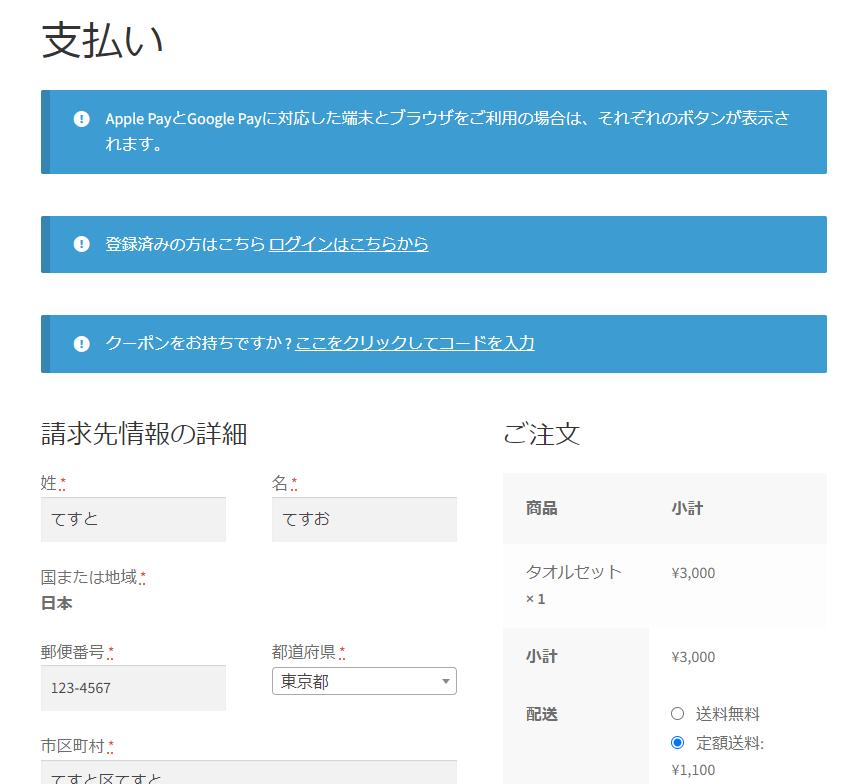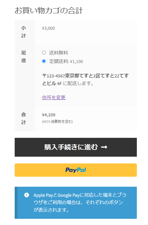 <div class="woocommerce-info">Apple PayとGoogle Payに対応した端末とブラウザをご利用の場合は、それぞれのボタンが表示されます。</div>